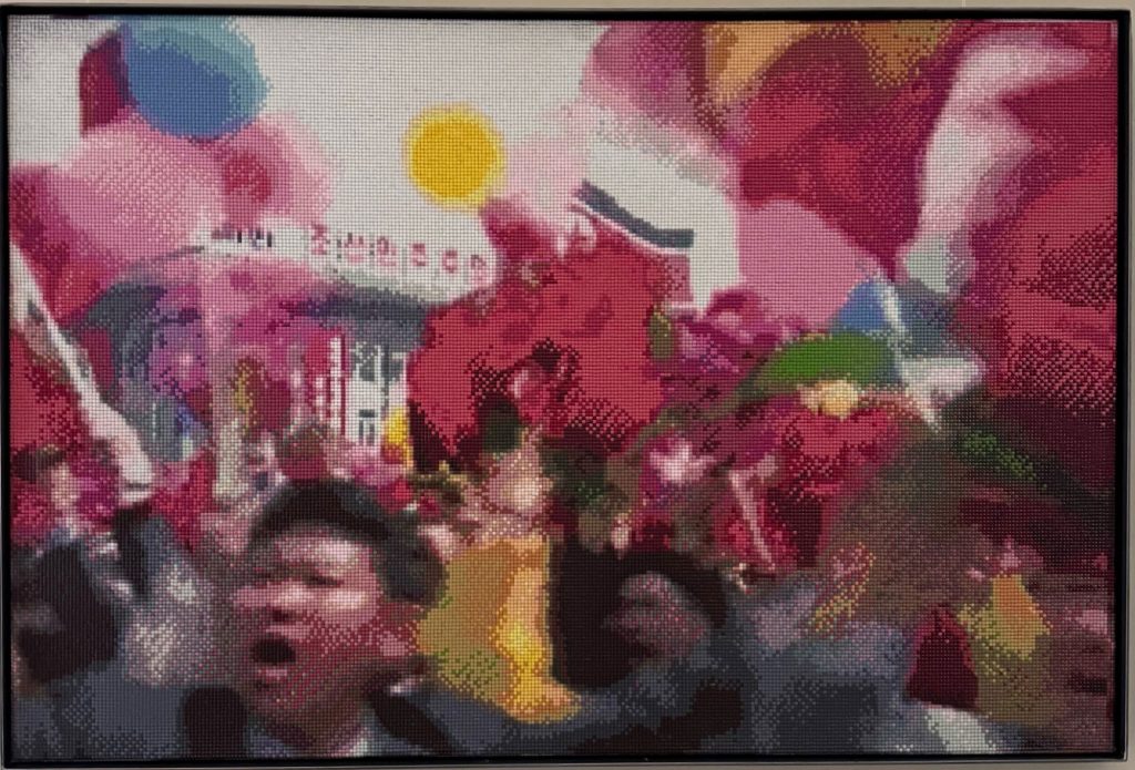Performing Waves, Performing Faith, 2025, Kunstharz-Perlen auf Leinwand und Holz im Künstler-Stahlrahmen,  96 x 96 x 3 cm